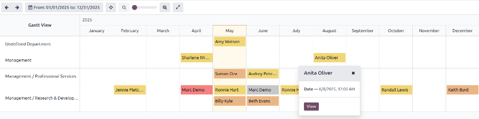 Analyze appraisal status, completion rate, and milestones using Kanban, calendar, Gantt, graph, and pivot views.