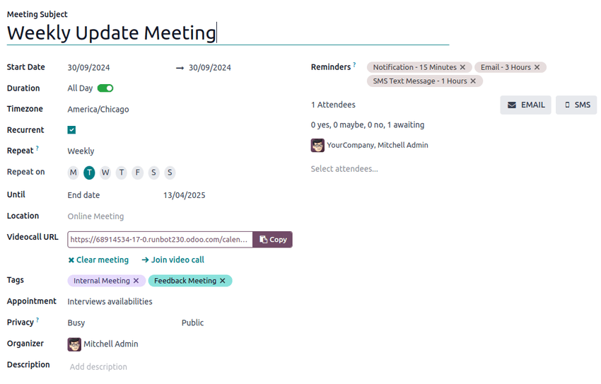Configure attendees, virtual meeting links, timezones, recurrence rules, reminders, tags, and privacy settings using an intuitive form.