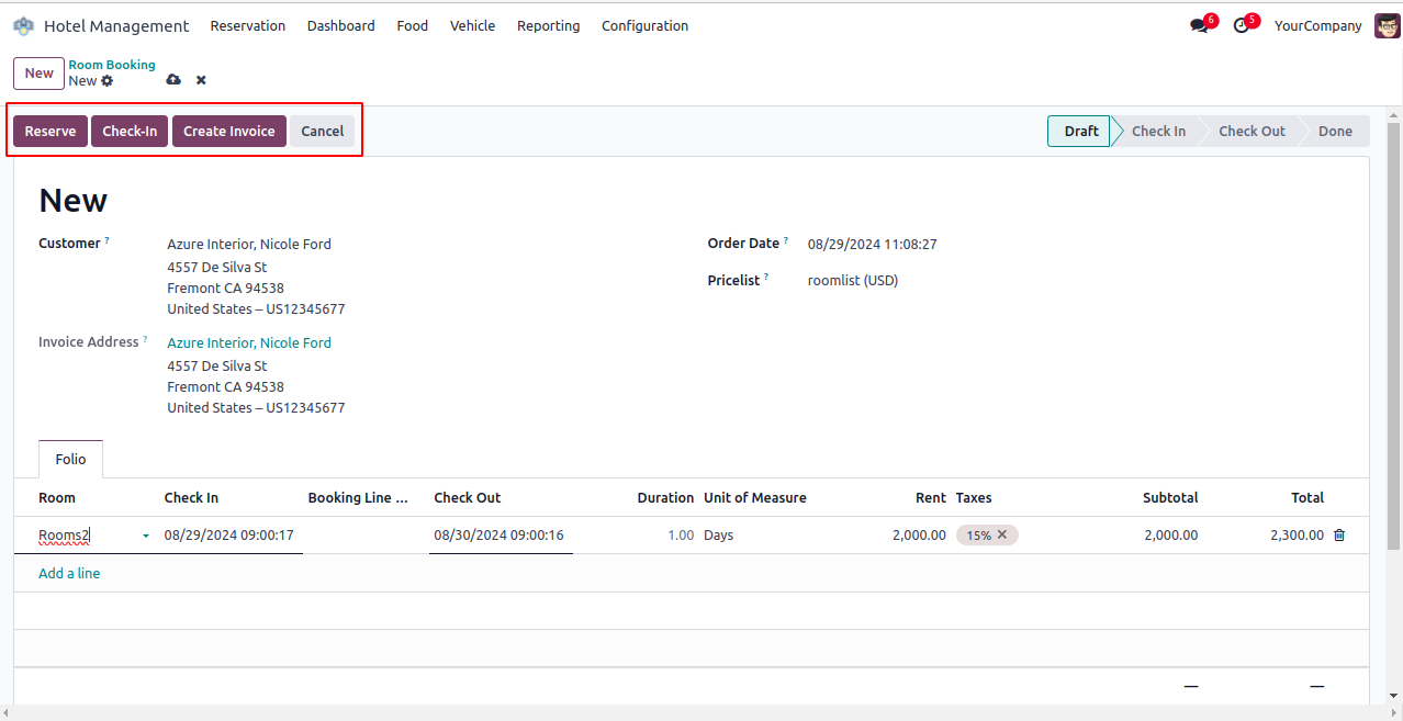 Reservations flow directly into check-in, service consumption, and final invoicing.