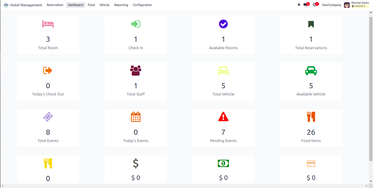 View occupancy levels, revenue, service usage, and housekeeping performance.