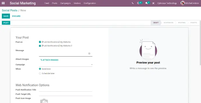 Create posts, add images, set publishing schedules, and configure push notification details for better timing